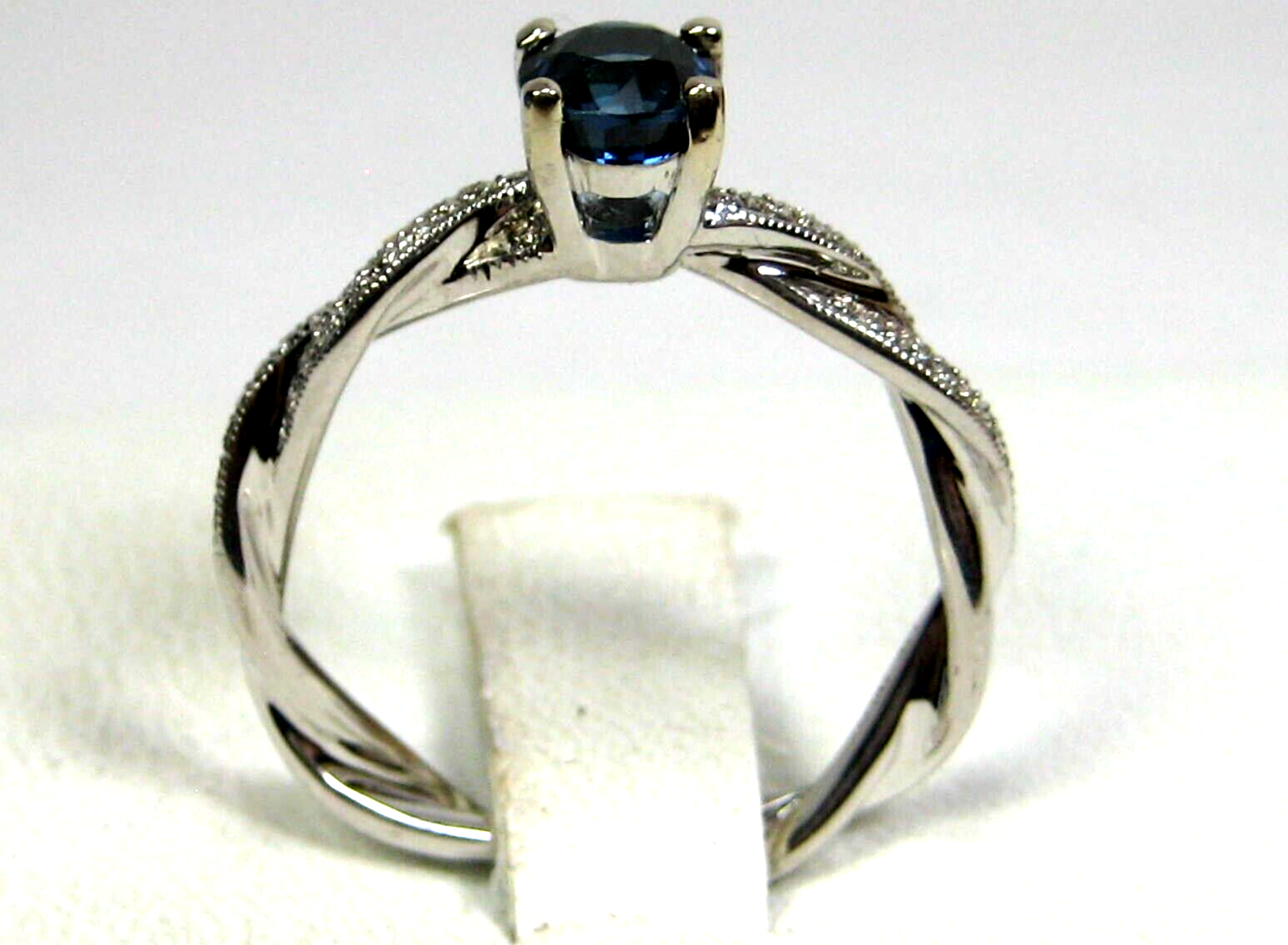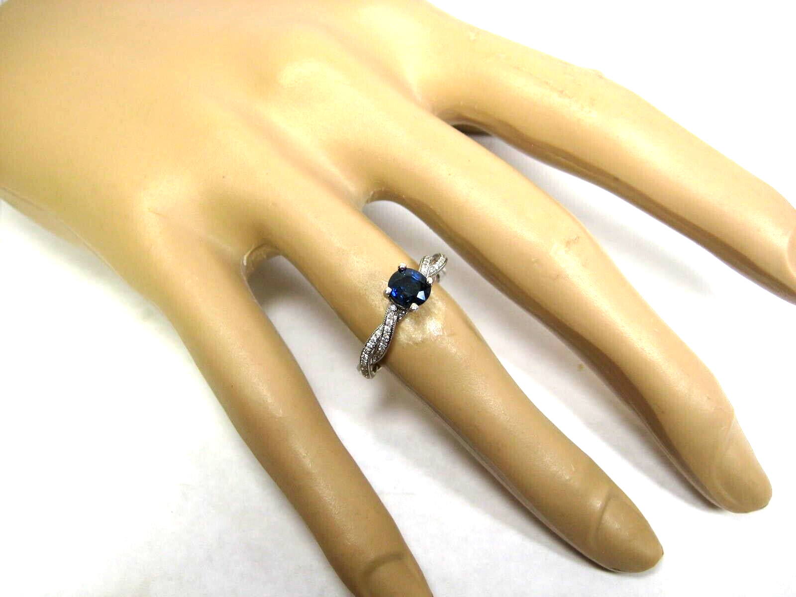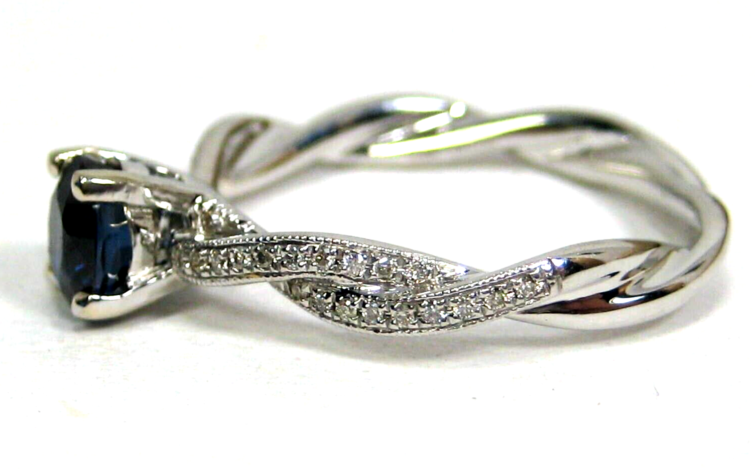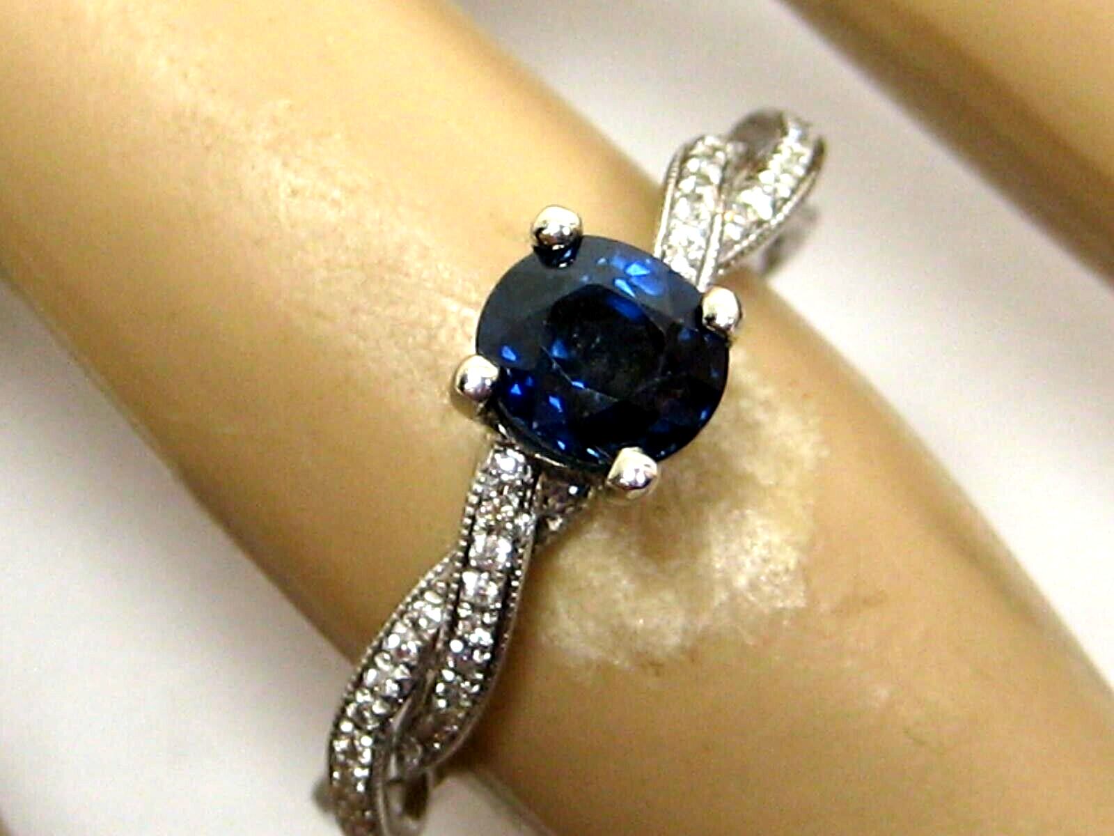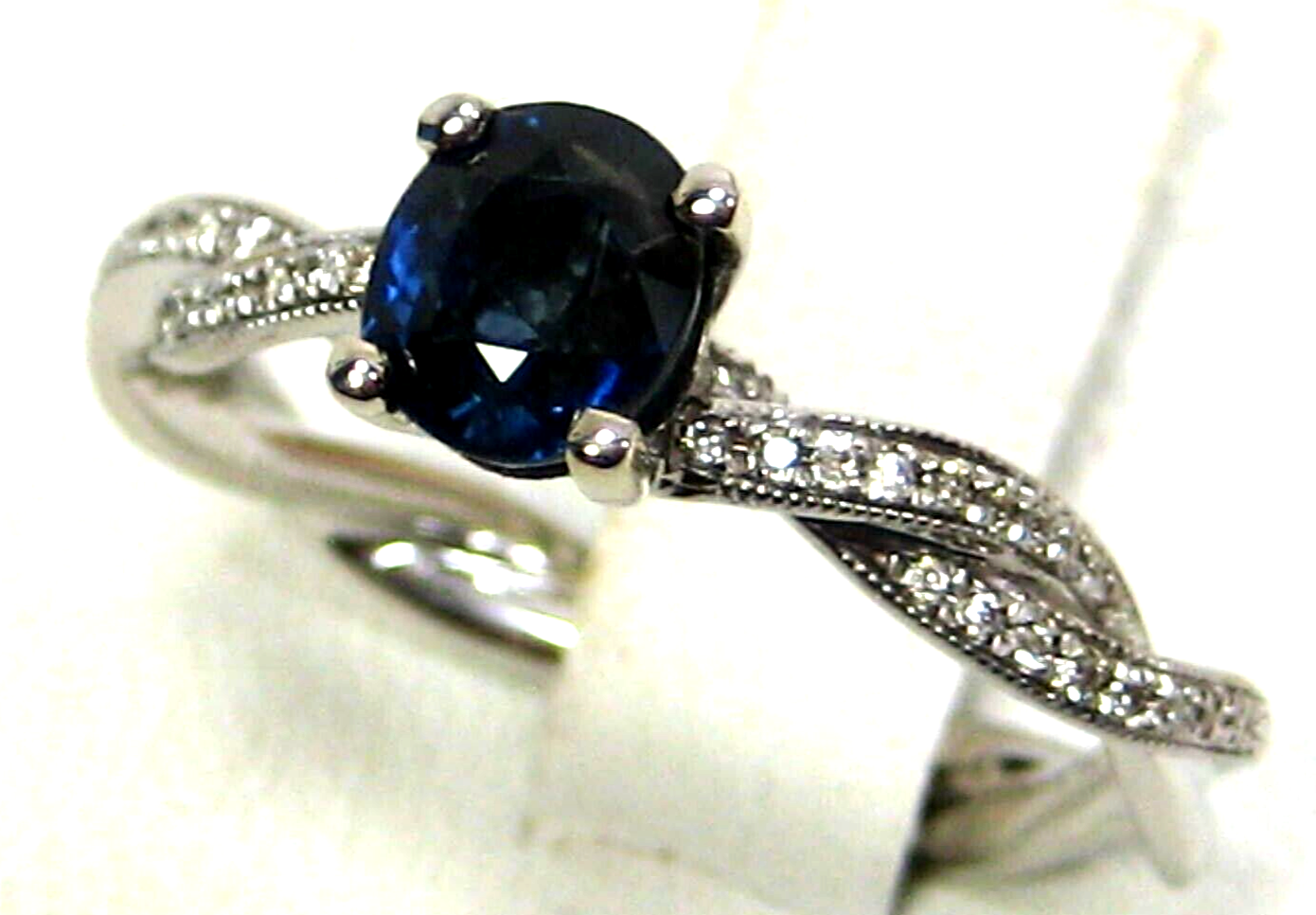The blue sapphire is a .98 carat oval cut that has deep blue color and eye clean clarity. The solitaire with accent filigree cross over setting is solid 14k white gold.